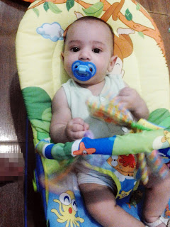 Pietrinho completou 4 meses há 1 semana mas já está impossivel, só quer ficar sentado e em pé, se arrasta na cama e no chão, segura nas coisas pra levantar e dá um trabalho danado pra comer as frutinhas. Ainda não iniciamos papinhas salgadas, ele toma suco de laranja lima ou melancia , come frutas e toma vitamina de mamão com banana e maçã.
